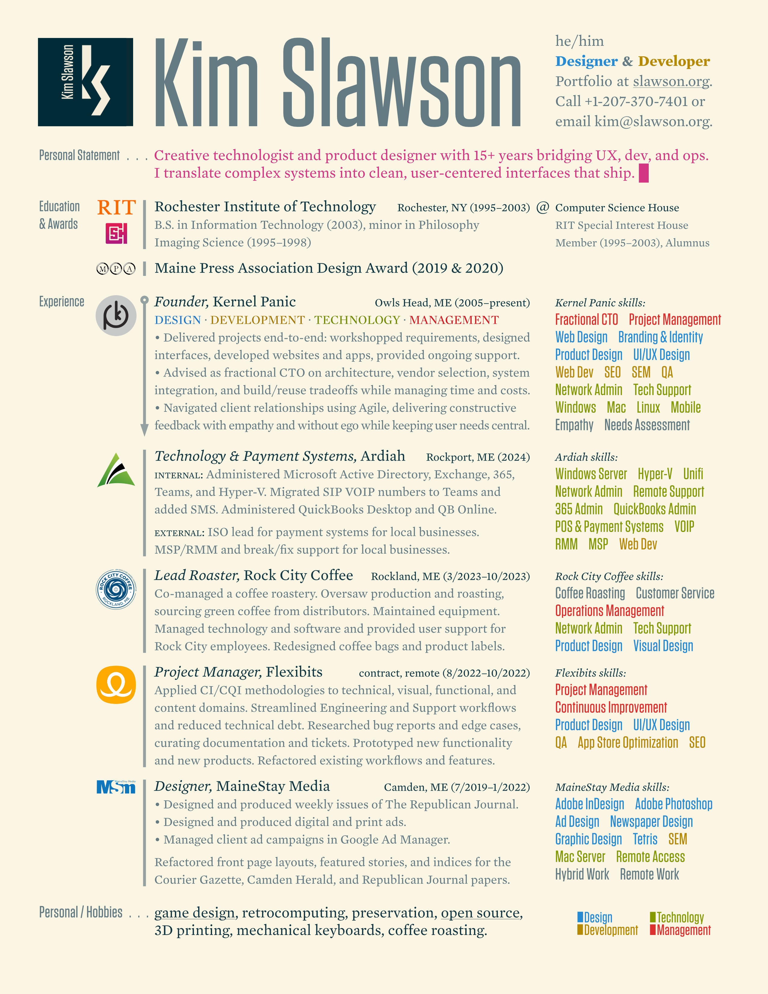 A designer and developer proficient in both screen and print media, Kim espouses simplicity and consistency. He speaks for the user, whose needs inform the design and development process from start to finish.